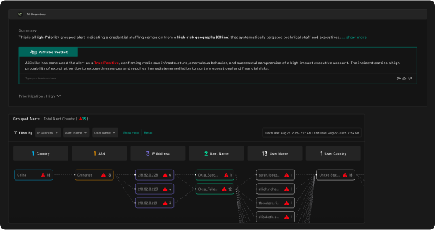 AiStrike links detections with asset and identity context, analyzes behavior patterns, maps related events into MITRE ATT&CK aligned attack chains, and enables proactive hunts directly on your data lake.